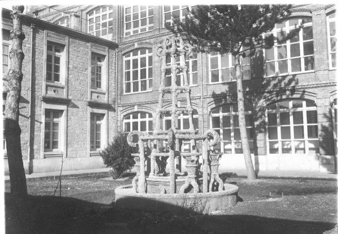 Estamos en una fecha relativamente temprana, cuando los esfuerzos por emplear y sistematizar las obras artísticas en el contexto psiquiátrico comenzaban a dar sus primeros pasos a nivel nacional. Por lo que, resulta difícil precisar si esta fuente, de la cual no he encontrado ninguna otra referencia visual o escrita, pudo ser realizada en el contexto de alguna suerte de terapia ocupacional. Puestos a soñar, cabe pensar que en aquel entonces alguno de los doctores del centro podría haber percibido la potencialidad del medio artístico para el diagnostico y el tratamiento psicoterapéutico, incentivando a este grupo de “alienados” a realizar la obra. A pesar de la escasa calidad de la fotografía, la “fuente” parece tener un aspecto rugoso, como si estuviera conformada o recubierta de piedritas ocultando el esqueleto de la misma. Incluso, parecer guardar cierta semejanza con uno de los grandes hitos del art brut internacional, el “palacio ideal” del cartero francés Ferdinand Cheval, una arquitectura fantástica construida durante más de tres décadas a base de miles y miles de piedras.