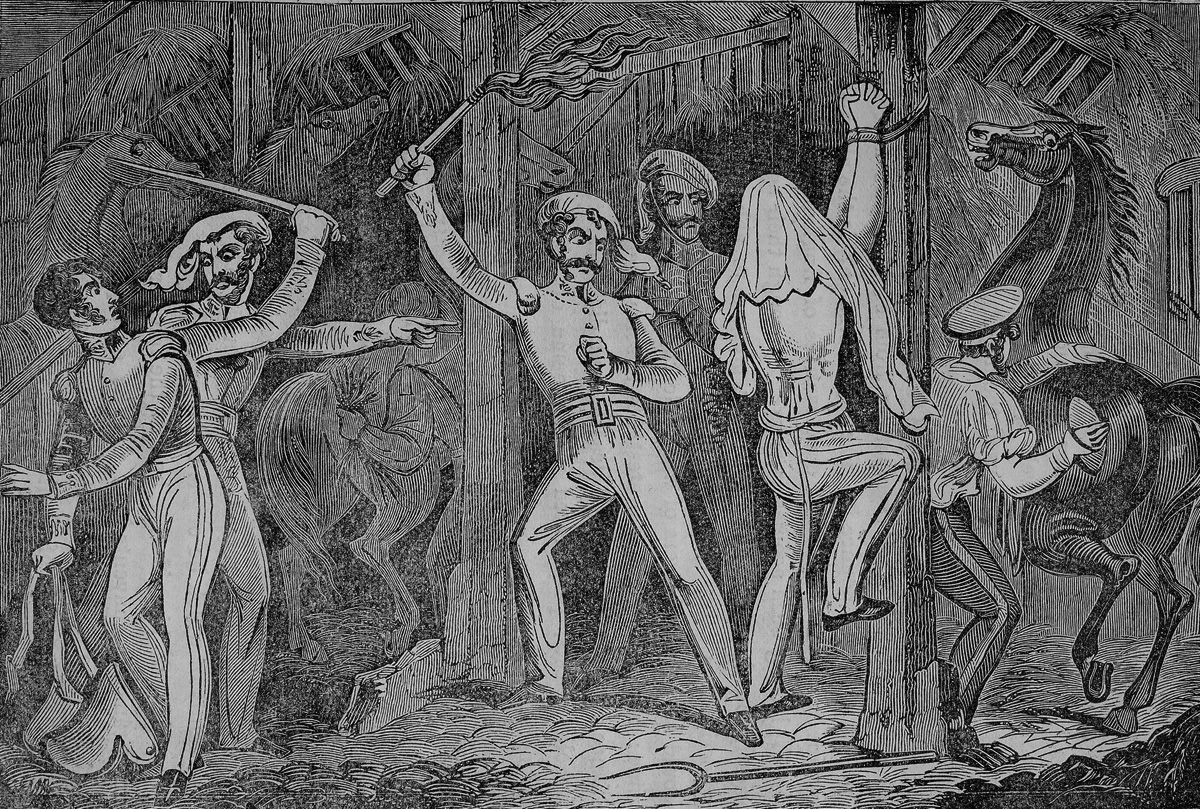 Este dibujo, incluido en el libro de Sommervile, da cuenta del modo en el que solía aplicarse el castigo, y explicita el amplio espacio destinado a este tema en el diario de este militar británico, que no duda en mencionar los cargos y apellidos tanto de los torturadores como de los soldados fustigados -y, en muchos casos, fallecidos-. En concreto, refiere la bestialidad de ciertos regimientos en los que llegaron a asegurarle que “no recordaban que pasara un solo día en Vitoria sin que alguno de los hombres fuera azotado”. Comúnmente, si había cerca un árbol, el hombre era atado y no se le golpeaba únicamente en la espalda, sino también en los miembros inferiores, para que no quedaran incapacitados para llevar sus mochilas o accesorios. Además, este autor critica fuertemente a los oficiales al mando que, en medio de la aplicación de los castigos, decidían arbitrariamente reducir los latigazos a la mitad, ganándose así fama de compasivos, puesto que “al tiempo que el oficial al mando se atribuía una espuria humanidad, él era en realidad la causa real y directa del castigo”. Conviene indicar que las causas que originaban estos consejos de guerra guardaban principalmente relación con la disciplina, los intentos de deserción y con faltas derivadas del alcoholismo, el juego, la venta de objetos y accesorios, etc.