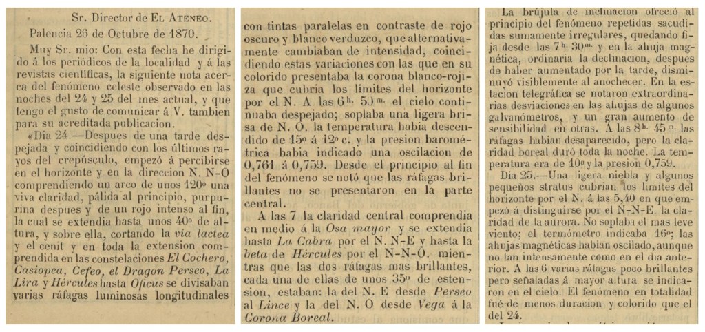 Pasado un siglo, una de las publicaciones en cierto modo herederas del espíritu científico de la Real Sociedad Bascongada, seguía arrojando luz acerca de las auroras boreales. El número del 31 de octubre de 1870 de la revista vitoriana El Ateneo, se hacía eco de un nuevo avistamiento2: