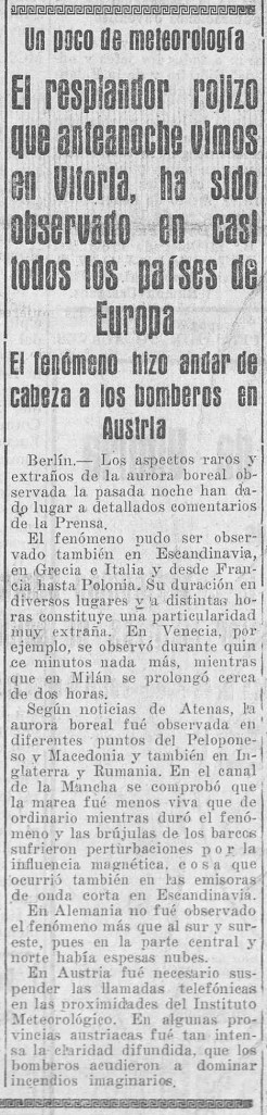Como cabía esperar ante un fulgor semejante, esta famosa aurora boreal también se pudo apreciar desde Vitoria. El titular del Pensamiento Alavés indicaba que “el resplandor rojizo que anteanoche vimos en Vitoria, ha sido observado en casi todos los países de Europa”, dando cuenta del modo en que respondieron ante el fenómeno en lugares tan dispares como Austria, Grecia o Alemania.