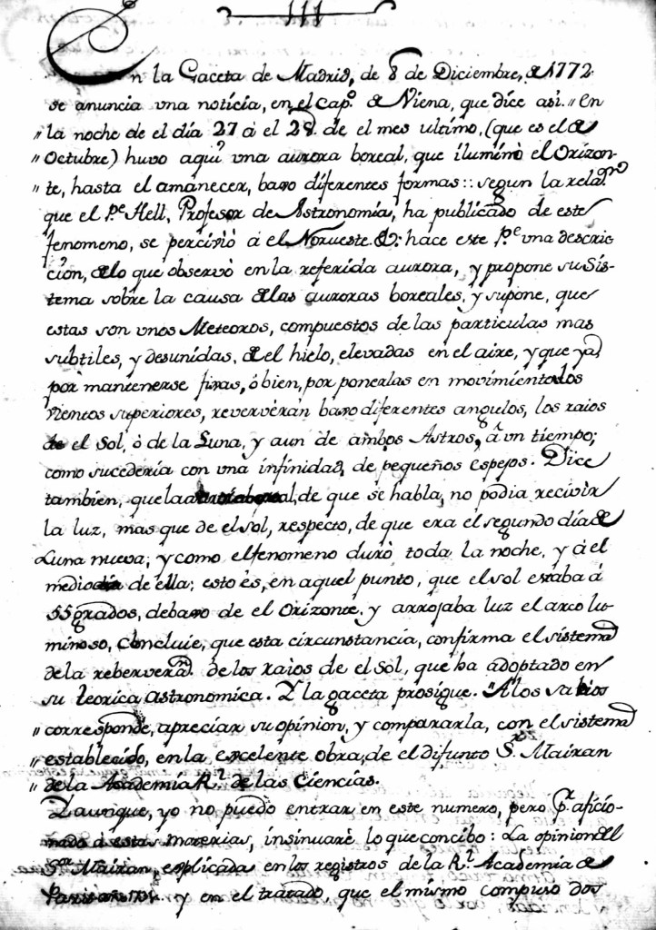 En realidad, lo que el cura de esta localidad navarra hizo, es trascribir un texto aparecido en la Gazeta de Madrid el 8 de diciembre de 1772, en el que el corresponsal en Viena ofrecía una pormenorizada crónica acerco de lo ocurrido. La alta actividad auroral que hubo en toda Europa durante el siglo XVIII incentivo la investigación científica del fenómeno1, confirmando definitivamente la naturaleza eléctrica del meteoro. De todos modos, el último párrafo del discurso conservado en el fondo Prestamero subraya la singularidad y el misterio que siempre le había rodeado: