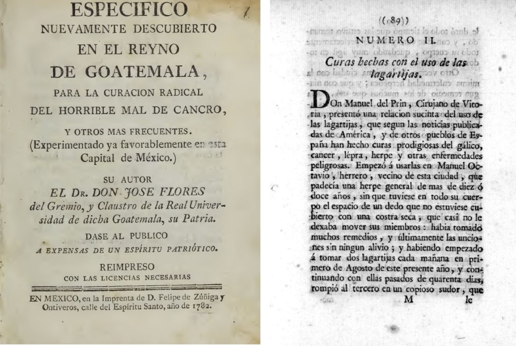 Según los extractos de aquella junta, Prin presentó “una relación sucinta del uso de las lagartijas, que según las noticias publicadas de América y de otros pueblos de España, han hecho curas prodigiosas del gálico, cáncer, lepra, herpe y otras enfermedades peligrosas” (conviene apuntar que algunos de los términos empleados en el XVIII no se corresponden con la nosología contemporánea). En realidad, aunque aquí se mencione a América en términos generales, la propuesta tenía un origen mucho más particular y se debía a un personaje de enorme interés. Justo un año antes, en 1782, veía la luz un breve folleto de quince páginas redactado por el ilustrado chiapaneco José Felipe Flores (1751-1824), catedrático de medicina en la Real Universidad de Guatemala. El texto llevaba por título Especifico nuevamente descubierto en el Reyno de Goatemala, para la curación radical del horrible mal del cancro, y otros más frecuentes, y buscaba analizar el poder curativo de la carne de lagartija según los saberes tradicionales del pueblo guatemalteco de San Cristóbal Amatitan (actual ciudad de Amatitlán).
