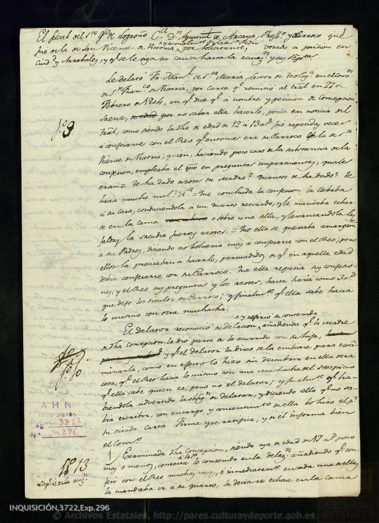 La voz de alarma había saltado el 27 de febrero de 1804. Pues bien, el 6 de abril de ese mismo año, sin que sepamos muy bien el modo, una nueva mujer se sumaba a la acusación. Se llamaba María Vicenta Saez de la Vega, tenía 20 años y había servido en casa del detenido durante una temporada. Allí, durante meses, el sacerdote “tuvo la pretensión de darle azotes los más de los días, diciéndole que no era pecado, ni tenía necesidad de confesarlo”. Y una noche, hacia las diez y media, se acercó hasta su cama, “la descubrió por fuerza y repitiendo que no hiciese caso, que no era pecado, consiguió dárselos”. Al parecer ella trato de resistirse y reprendió al cura, pero el repetía que aquello no era pecado, que tenía facultades para dárselos y que estaba completamente en su cabal juicio. Llegados a este punto, indudablemente, el delito de solicitación tal y como lo hemos descrito parece más que evidente. De hecho, le confirmó que era suficiente con confesarse ante él, admitiendo que había ofendido a Dios y que recibiría la absolución. Tras escuchar esta nueva denuncia, los encargados de la causa ven evidente que el acusado ha ejercido una influencia escandalosa, con “inducción a errores” y sembrando “doctrina contra la fe y buenas costumbres”. En todo caso, no les parece que tenga nada de hereje, y consideran que sus actos tan solo buscaban saciar su lascivia. Desde el punto de vista inquisitorial, como podemos comprobar, el solicitante ejercía como un elemento corruptor, que pervertía el sentido ultimo de su labor: la sanación de las almas.