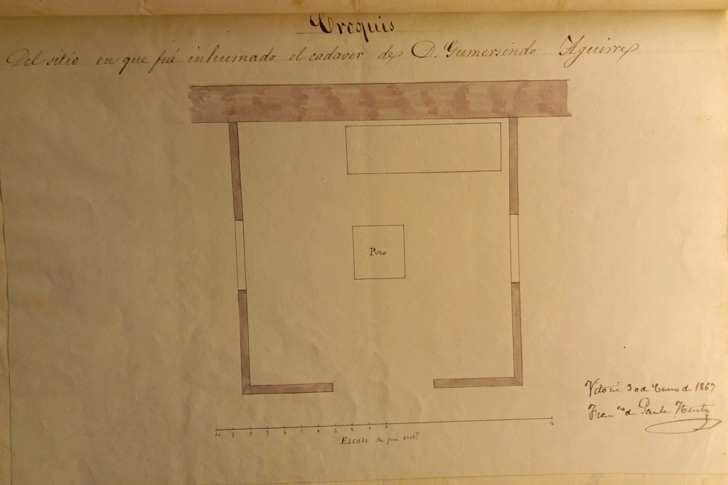 El 30 de enero de 1867 el arquitecto municipal de Vitoria (Francisco de Paula Hueto Ruiz de Azúa) dibujó, sin duda, uno de los croquis más singulares de su carrera. Lo haría en un periquete, revestía poca o ninguna dificultad, y, firmado de su puño y letra, nos legó un diseño “del sitio en que fue inhumado el cadáver de D. Gumersindo Aguirre”.