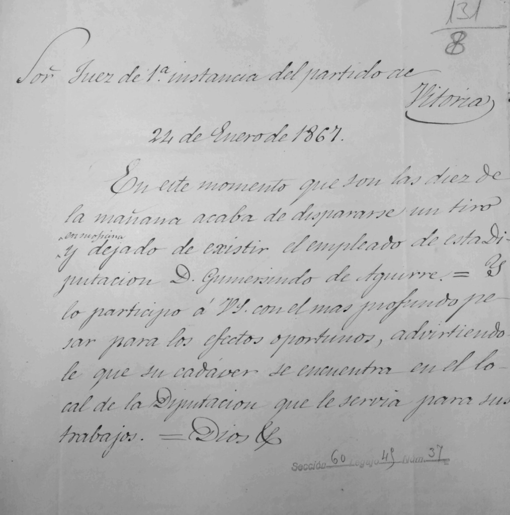 El 24 de enero de 1867 (jueves), la capital alavesa se veía convulsionada por una triste noticia. Entre las 9:30 y las 10:00 de la mañana, el tesorero de la Diputación de Álava, el Sr. Echevarri, escuchó una detonación en el despacho contiguo de la oficina de intervención de cuentas de la casa palacio, a la que acudió raudo encontrándose un “cuadro terrible”: allí estaba Gumersindo de Aguirre, “sentado en su silla y apoyado el cuerpo en el bufete, con el cráneo deshecho, se hallaba el infeliz suicida bañado en su propia sangre”.