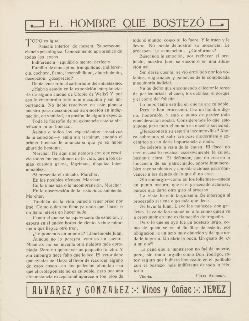 Aquí le perdemos la pista al bueno de Félix. Son tan solo un puñado de textos, una autentica micro-aportación a las letras alavesas, pero algunos de estos renglones resultan ciertamente inspirados, ¿no creéis?. Desde luego, es posible que el recuerdo de este escritor siga vivo entre sus herederos. Quizás publicó más relatos o colaboró con otros medios locales. Pero, por el momento, hasta aquí puedo leer.