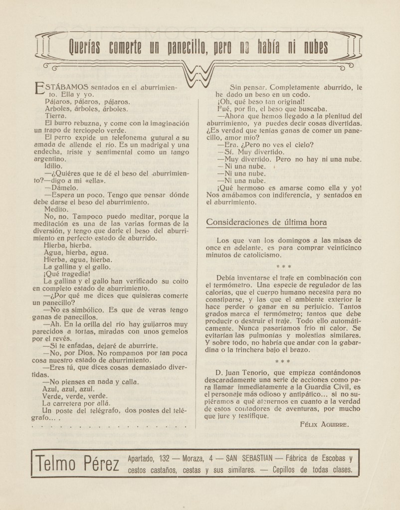 En esta ocasión, sin embargo, vamos a centrar nuestra atención en un colaborador muy activo de El pájaro azul (figura incluso como director artístico en diversos números), recuperando una parte sustancial de sus escritos: Félix Aguirre. Lo cierto es que no cuento con ninguna referencia acerca de su persona, por lo que, a día de hoy, únicamente conozco sus aportaciones en la revista. Un completo desconocido que nos legó varios textos particularmente inspirados, en los que es posible intuir el influjo de Ramón Gómez de la Serna y de cierto humorismo muy en boga en las revistas de la época.
