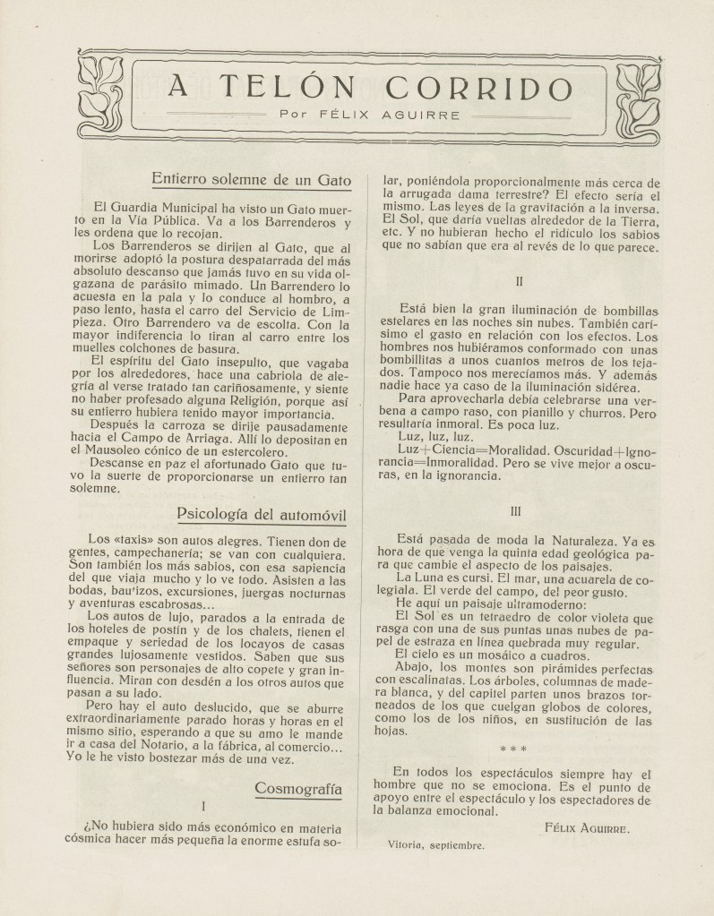 La primera colaboración de Aguirre la encontramos en el nº de septiembre de 1929. Y el tono, extensión y estilo de estos tres microtextos denota un regusto ramoniano más que evidente. En 2020 tuvimos el honor de poder editar en Sans Soleil Ediciones un volumen titulado Buen Humor, recuperando los relatos ilustrados de Gómez de la Serna publicados en el semanario homónimo durante la década de los años veinte. La ‘psicología del automóvil’ de Aguirre recuerda poderosamente a muchos de los textos más ingeniosos del literato madrileño, en los que se interrogaba sobre el alma y la psique de las cosas: