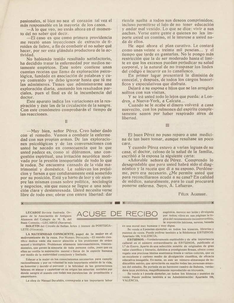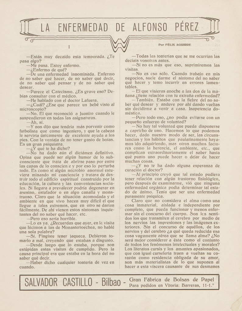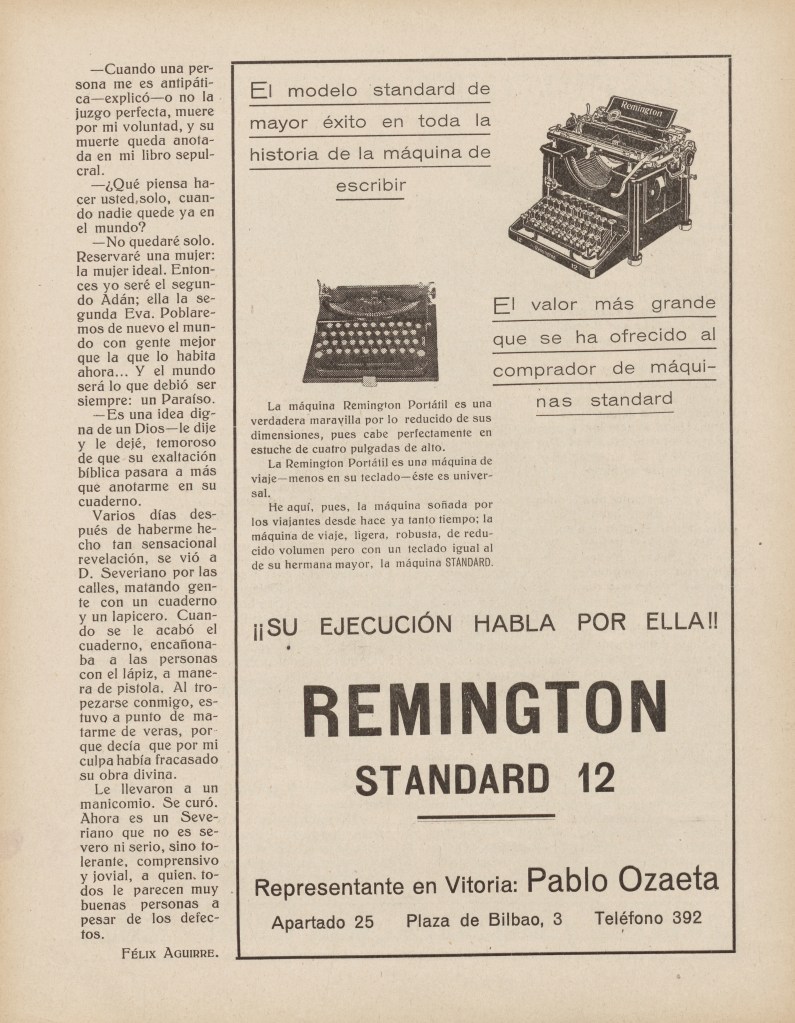 Llegados a este punto, la obra de Félix Aguirre parece marcada por cierto tono reflexivo, con apuntes filosóficos y una carga psicológica importante. Y, además, muchos de sus relatos tienen un regusto decadente y macabro, algo que se confirma en el fabuloso texto aparecido en el número de abril de 1930: ‘Las ideas tenebrosas de D. Severiano’, “un misántropo de lo más avanzado en antropofobia”: