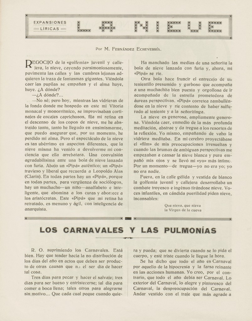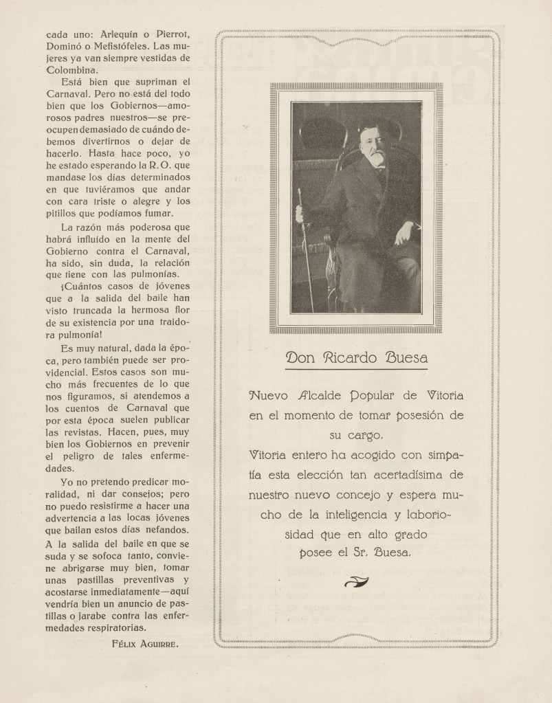 En el mes de febrero de 1930 Aguirre reflexiona sobre ‘Los carnavales y las pulmonías’. Conviene recordar que justo entonces llegaba a su fin la dictadura de Primo de Rivera, momento en el que las festividades carnavalescas se vieron limitadas en buena parte de la península: