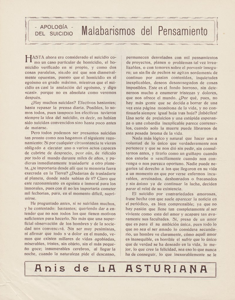 En marzo el escritor vuelve a la carga, y nos regala un nuevo texto: ‘Malabarismos del pensamiento’. Se presenta como una apología del suicidio e introduce otra característica de raíz ramoniana; un marcado humor negro. Antes de ser perjudicial a otro, de causar cualquier mal, mejor optar por la “solución radical, exacta”: