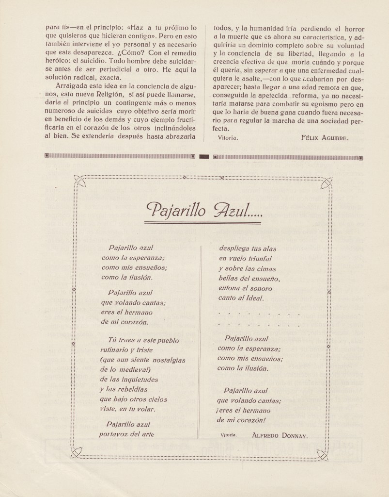 En una entrada precedente ya recuperamos la figura de Alfredo Tabar Ripa, autor de las “casi novelas”, una serie de relatos cortos elaborados a finales del XIX en la capital alavesa. En esta ocasión, volvemos a fijar nuestra atención en el panorama literario local, pero avanzamos un poquito más en el tiempo para revisar los números de una publicación que vio la luz en Vitoria en el año 1928: El pájaro azul.