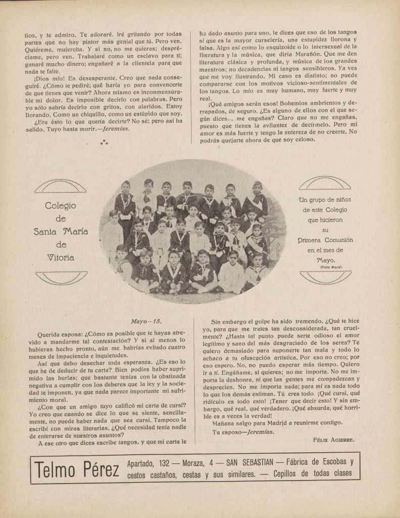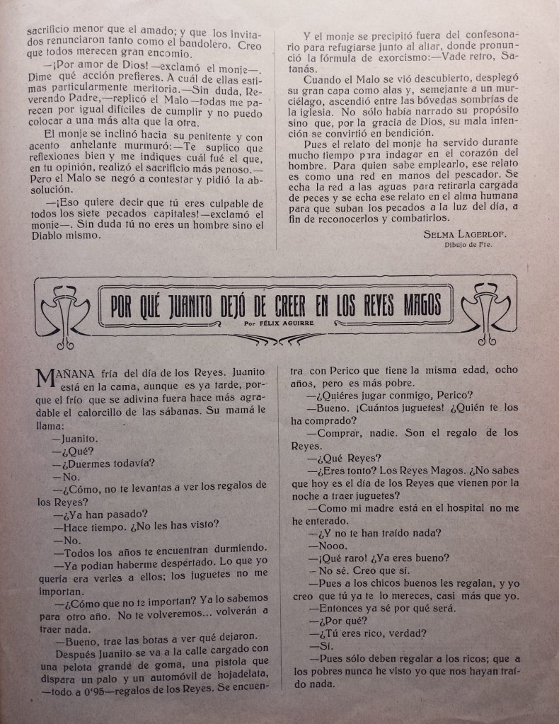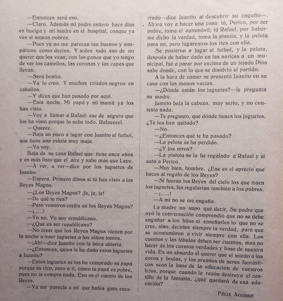 Para terminar, encontramos únicamente dos aportaciones más de Aguirre en los sucesivos números de la revista. En mayo ‘Las lamentaciones de Jeremías’, con el protagonista carteándose con su (ex) mujer artista, que ha decidido poner tierra de por medio y vivir en el mundillo bohemio madrileño. Y, ya en diciembre de 1930, un último escrito acorde con el tono navideño y atravesado por un cierto mensaje social: ‘Por qué Juanito dejó de creer en los reyes magos’: