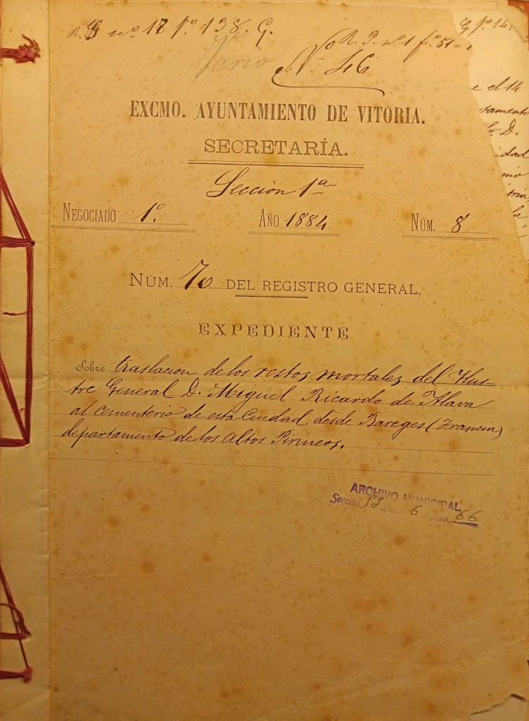 Los años pasaban y el deseo no terminaba de consumarse. Al fin, a comienzos de 1884, el proceso echó a andar, y se conserva en el Archivo Municipal de Vitoria-Gasteiz un completo expediente “sobre traslación de los restos mortales del ilustre General D. Miguel Ricardo de Álava al cementerio de esta ciudad […]”, en el que se da cuenta del proceso de repatriación de esta suerte de ‘héroe’ local (aunque en una entrada precedente ya aludimos a ciertos momentos de su vida en los que la honra del personaje se vio mermada y atacada a nivel local).