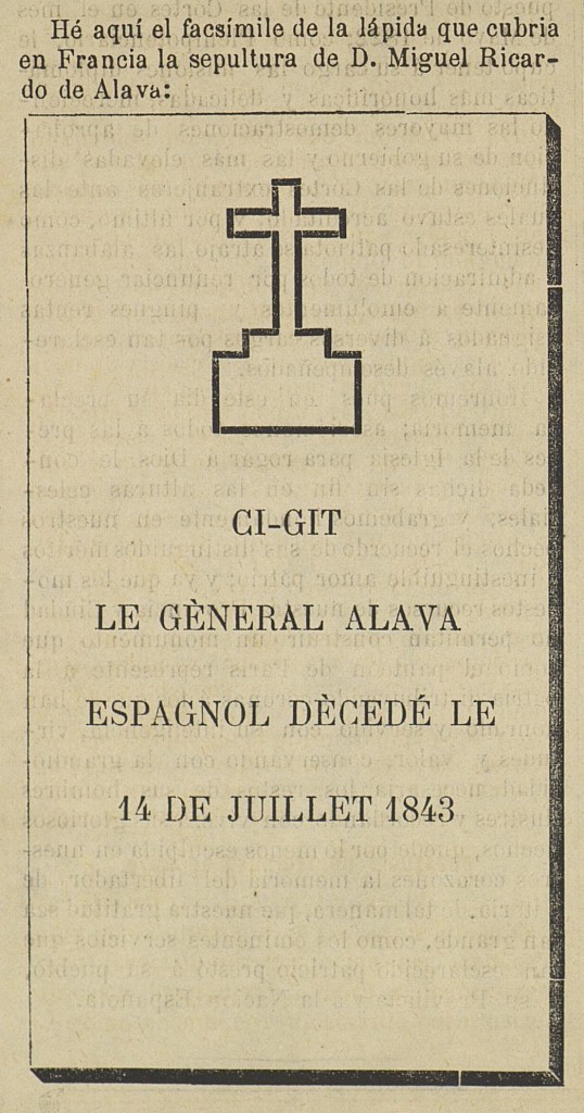 No sabemos cuando se verificará la traslación de los restos del general don Miguel Ricardo de Álava que yacen en el modesto cementerio de Barege, Altos Pirineos, para ser depositados en el precioso panteón que con ese objeto se erigió hace muy poco tiempo en el camposanto de la ciudad.