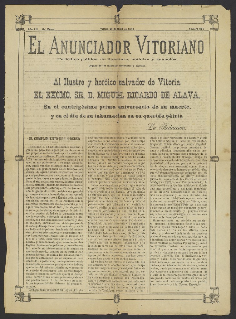 Vemos, por tanto, que el consistorio ya había adquirido la costumbre de solemnizar el aniversario con una visita a la viuda de Miguel Ricardo de Álava y Esquível. Para confirmarlo, basta revisar la hemeroteca y localizar algún recorte al respecto durante esa misma década. Por ejemplo, en 1865 El porvenir alavés anotaba: