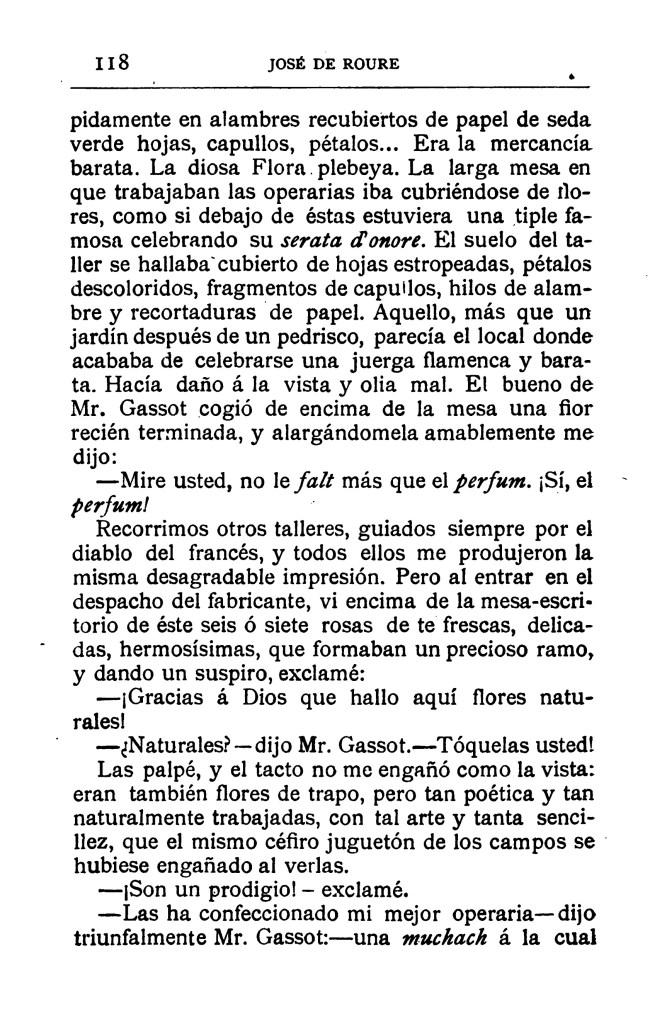 Bullía en su mente un sin fin de novelas terroríficas y de dramones el género más estrafalario; pero en sus trágicos pensamientos y proyectos descollaba, siempre viva, la chispa del ingenio. Era por aquellos días, cuando veraneaba en Vitoria el docto catedrático de la Universidad Central, D. José Amador de los Ríos, unido con vínculos de estrecha amistad, con el inspirado poeta Juan Justiniano Nepomuceno y Arribas y el padre de José Roure, D. Jerónimo. Y aquel docto catedrático y este inspirado poeta, se hacían lenguas y reían a carcajadas, que encerraban cariño y admiración, de los fenomenales proyectos literarios que el niño Pepe Roure exponía y defendía con singular atrevimiento.