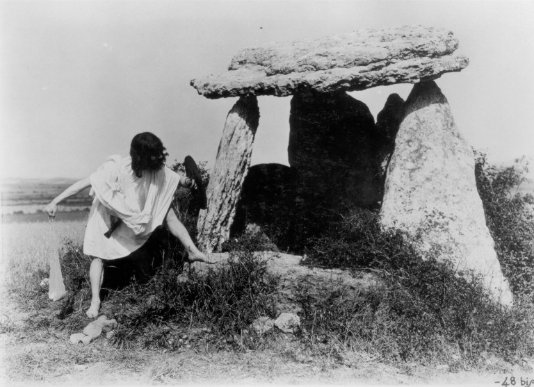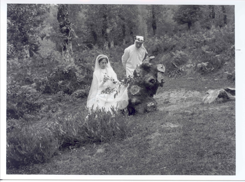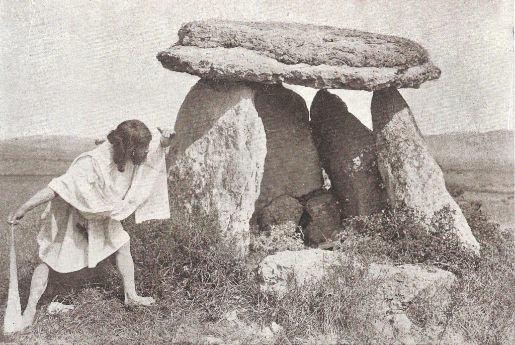 Una vez más, debemos fijarnos en los detalles. La mujer, vestida elegantemente de blanco, lleva una rueca o torno de hilar en la mano, un objeto asociado irremediablemente en el contexto mitológico vasco a las lamias (figuras femeninas que habitaban en cuevas o ríos) y las mairis (genio dotado de fuerzas colosal). Aunque esta imagen no ha contado con apenas difusión, me temo que es el complemento perfecto a las fotografías del aguerrido guerrero junto al dolmen, pues refleja la otra ‘hipótesis’ o lectura simbólica acerca de los elementos megalíticos: su origen mítico, asociado a seres mitológicos que habitaban en las inmediaciones.