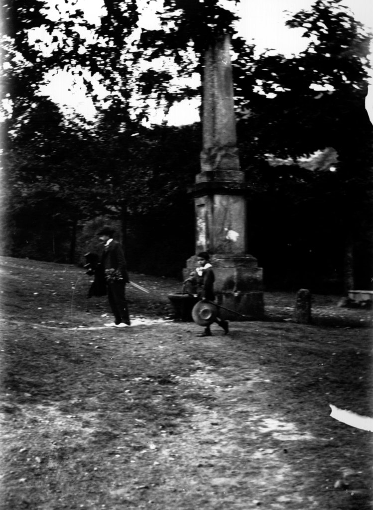 Vemos al cazador cazado, pues en esta singular ‘meta-imagen’ apreciamos a un fotógrafo realizando su labor, mientras otro capta el momento, reflejando el ‘fuera de cuadro’, con Baraibar atento en compañía de un par de mujeres. Es una de las pocas imágenes de la colección Baraibar-Elorza en donde se nos muestra ‘el cómo’, la dimensión logística y técnica de todo este legado. Este hecho vuelve a repetirse en la siguiente fotografía, donde Baraibar (o quizás Elorza) camina junto a su sobrino Antonio, acarreando una cámara fotográfica de fuelle montada en un trípode. De este modo, sabemos que en ocasiones portaban dos cámaras en sus viajes y excursiones.