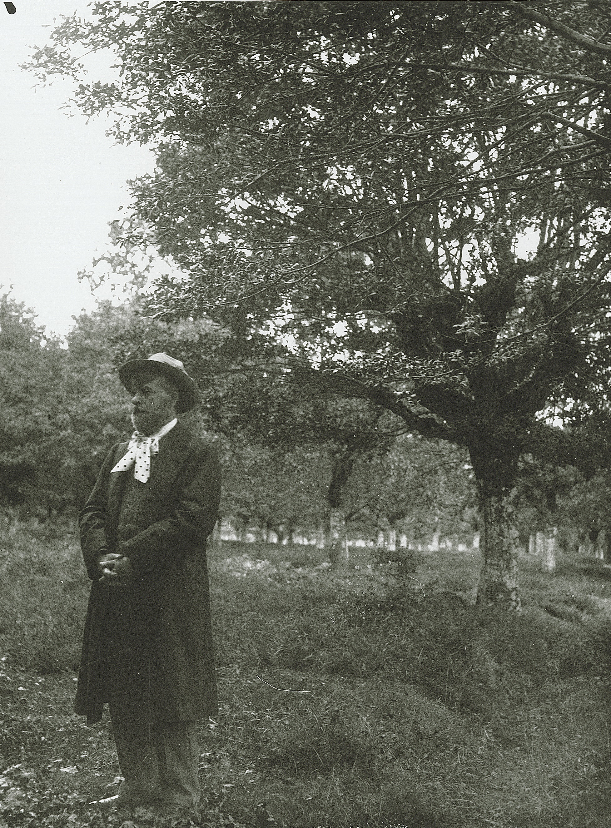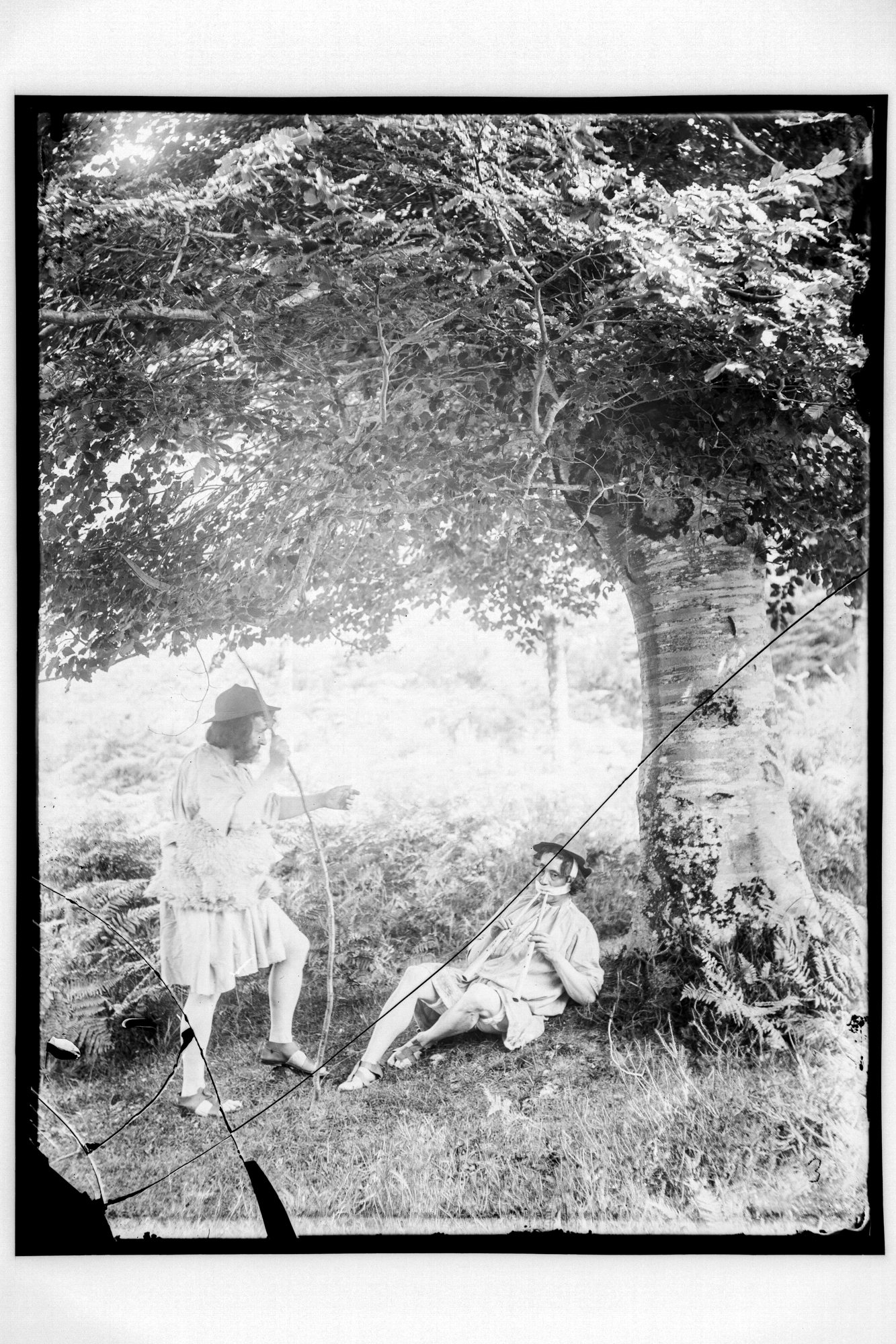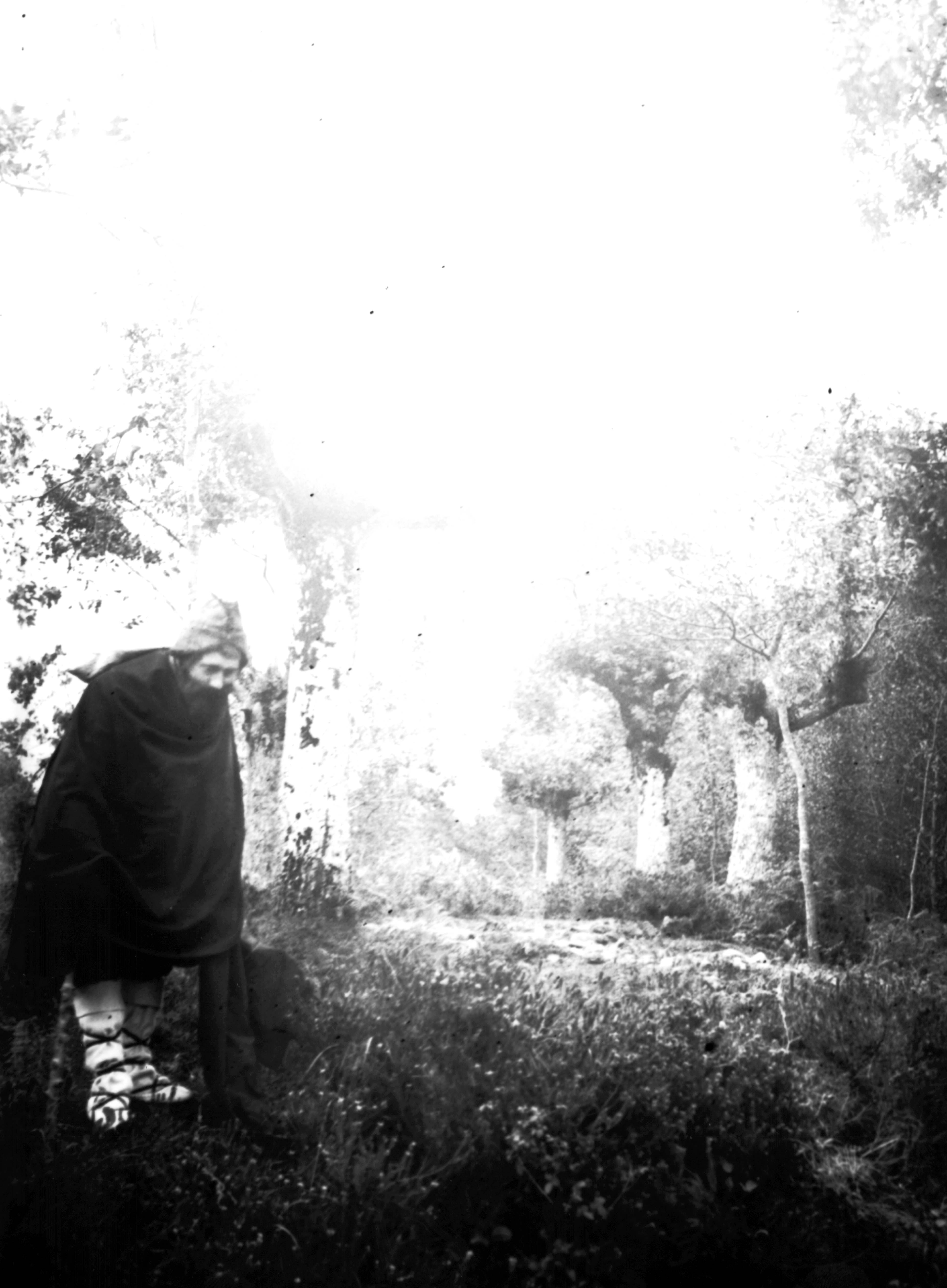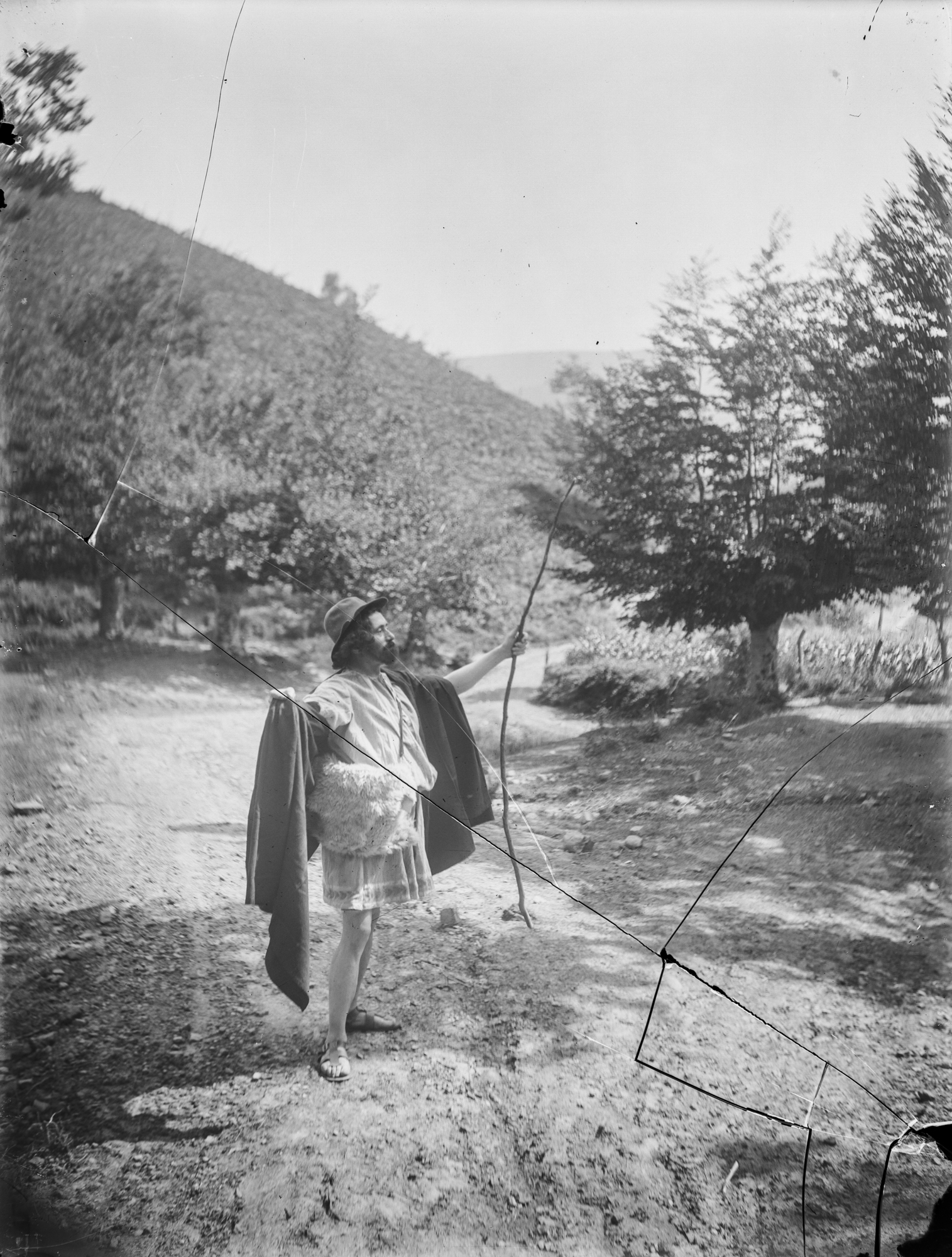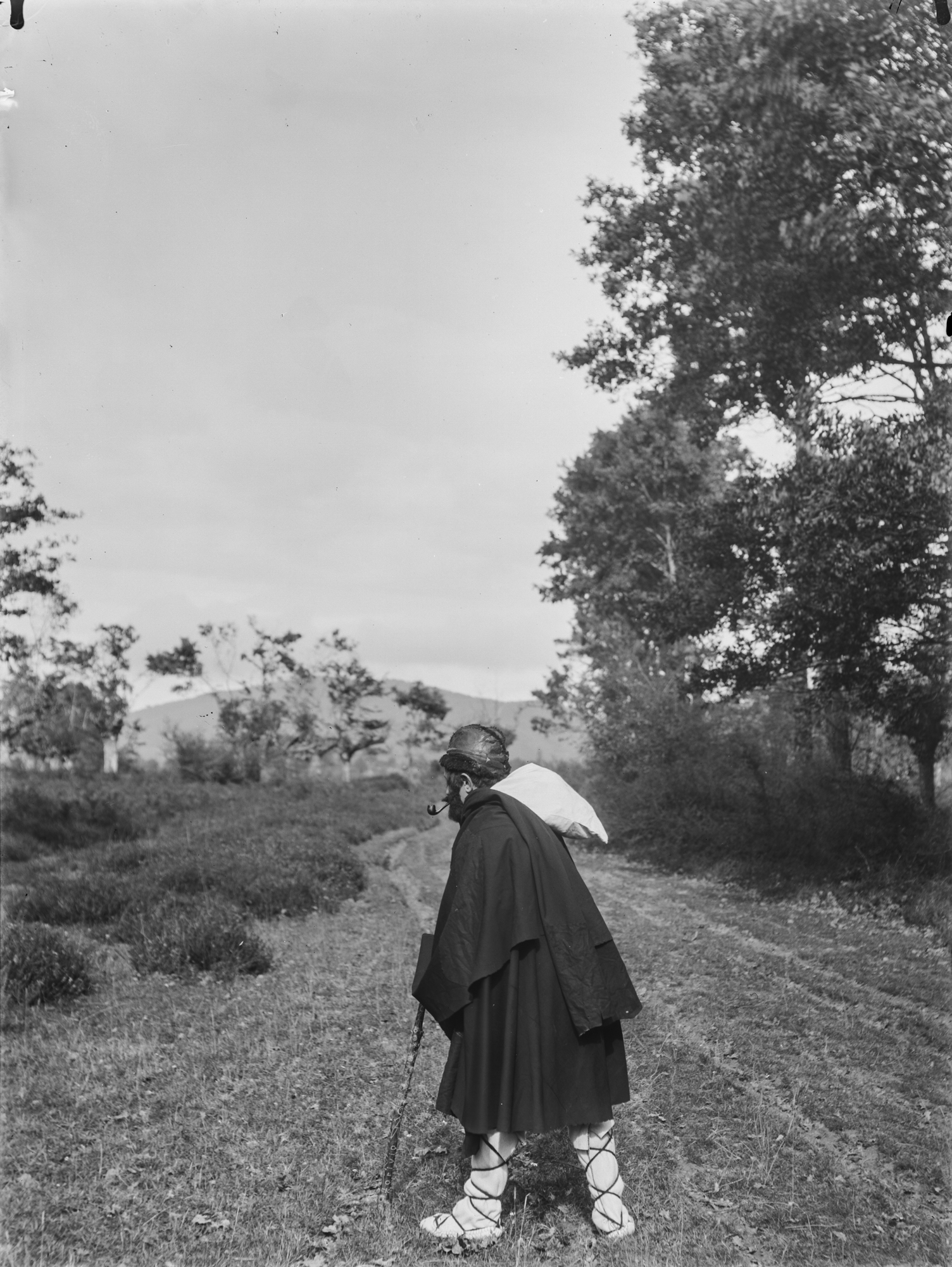 Por último, hay dos fotografías en la colección donde observamos a un hombre disfrazado en mitad del campo. Con barba postiza, fumando en pipa, calzado con alpargatas y portando un pequeño saco, es difícil apuntar mucho más. ¿Posible dramatización de otro personaje mitológico, un Gentil por ejemplo? Nos puede recordar levemente el aspecto del Olentzero y, la definición de las fotografías es tal, que en el bastón -decorado con incisiones y dibujos- podemos leer ‘Torivio’.