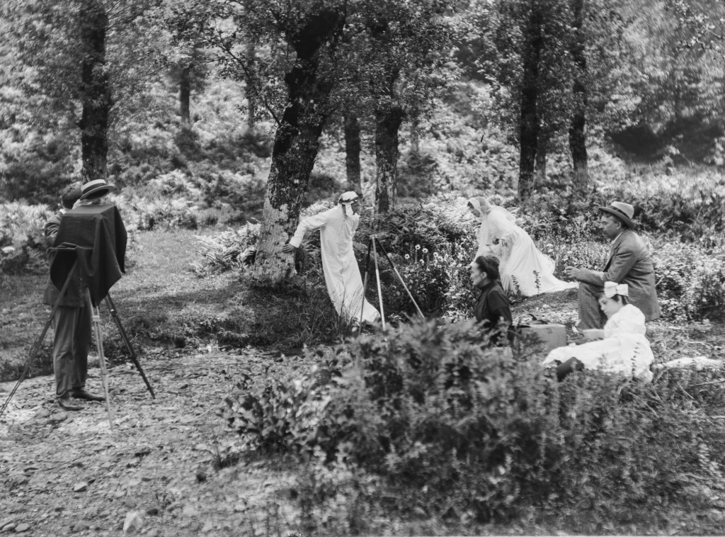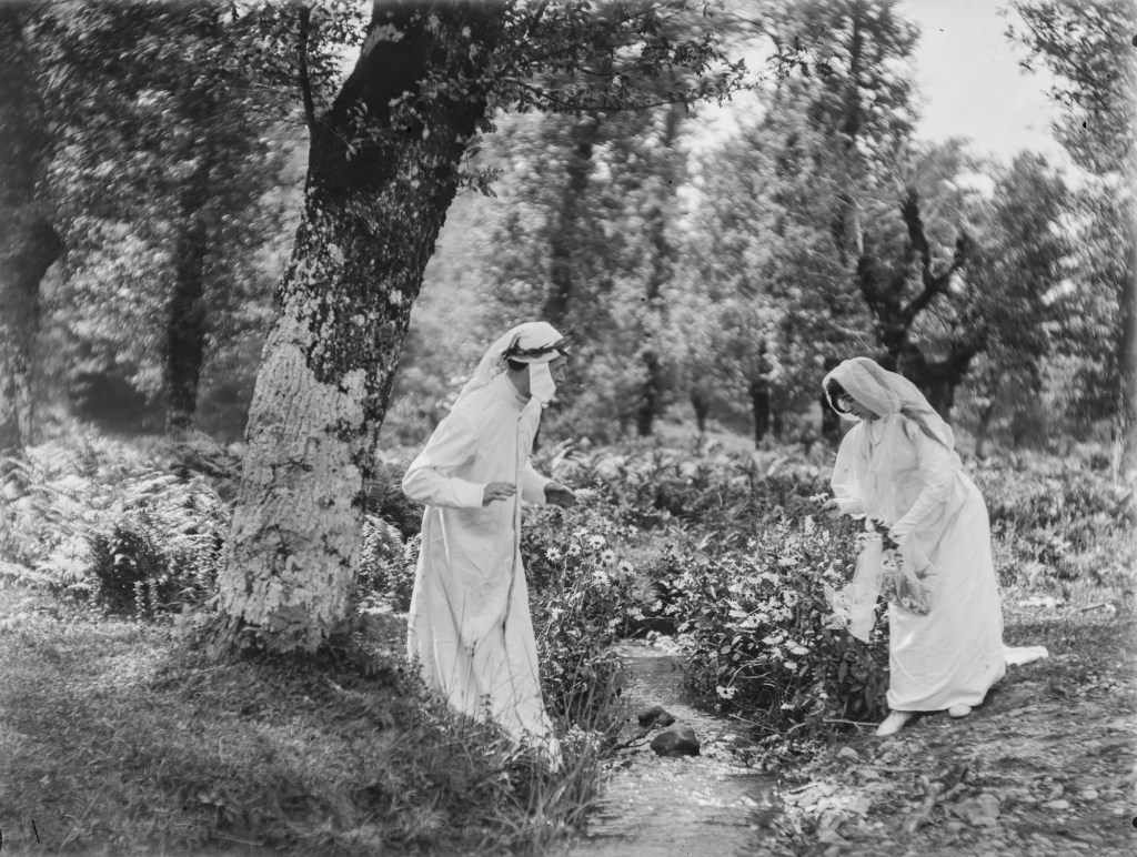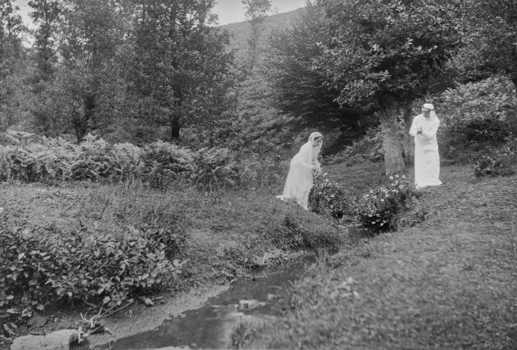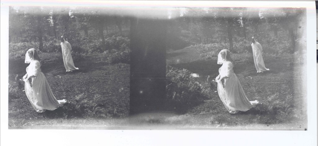 Tres parecen haber sido tomadas de forma consecutiva, al recrear el encuentro junto al riachuelo. En otra, vemos al figurante que personifica a Dante posando con un libro en la mano. Y quizás lo más sorprendente es comprobar que una de las imágenes es una fotografía estereoscópica en placa de cristal -algo común en la colección de Gonzalo Busto-, lo cual daría una cierta sensación de relieve o tridimensionalidad a la escena. Desde luego, ese día Baraibar, Elorza, Gonzalo Busto y compañía sacaron todo el aparataje al campo.