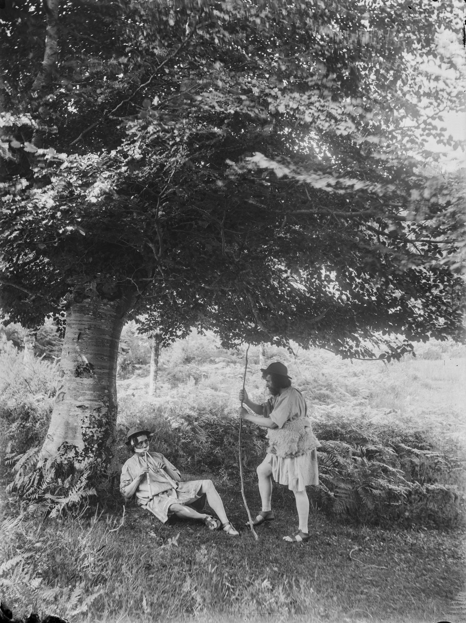 La escena la protagonizan dos hombres, que mantienen una suerte de dialogo bajo la frondosa copa de un árbol. Uno de ellos, recostado, hace sonar el aulós, instrumento musical de viento de la Antigua Grecia. El otro le mira y escucha, porta un ligero bastón y va vestido con un chaleco o zurrón de lana. Nos resulta imposible concretar más, pero todo parece indicar que se trata de la dramatización de una escena perteneciente a algún drama satírico de la Antigua Grecia.