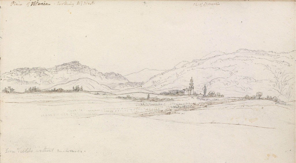 La anotación a mano indica: “Plain of Vitoria, looking to the West” [Llanura de Vitoria, mirando hacia el Oeste], y nuevamente “Ch. of St Martin”. Es difícil precisar si se trata de la misma iglesia (ya que la advocación coincide) reflejada desde una distancia muy superior. Abajo además se añade: “Corn Fields without enclosures” [Campos de maíz sin cercados]. En cualquier caso, nos ofrece la confirmación de que Vivian se movió por el Oeste de la ciudad, justamente la zona donde el encontronazo bélico tuvo lugar.