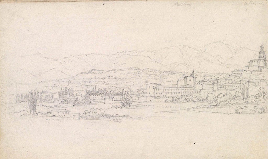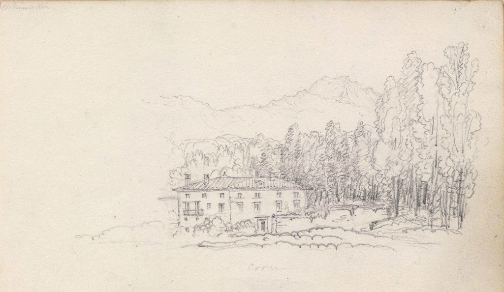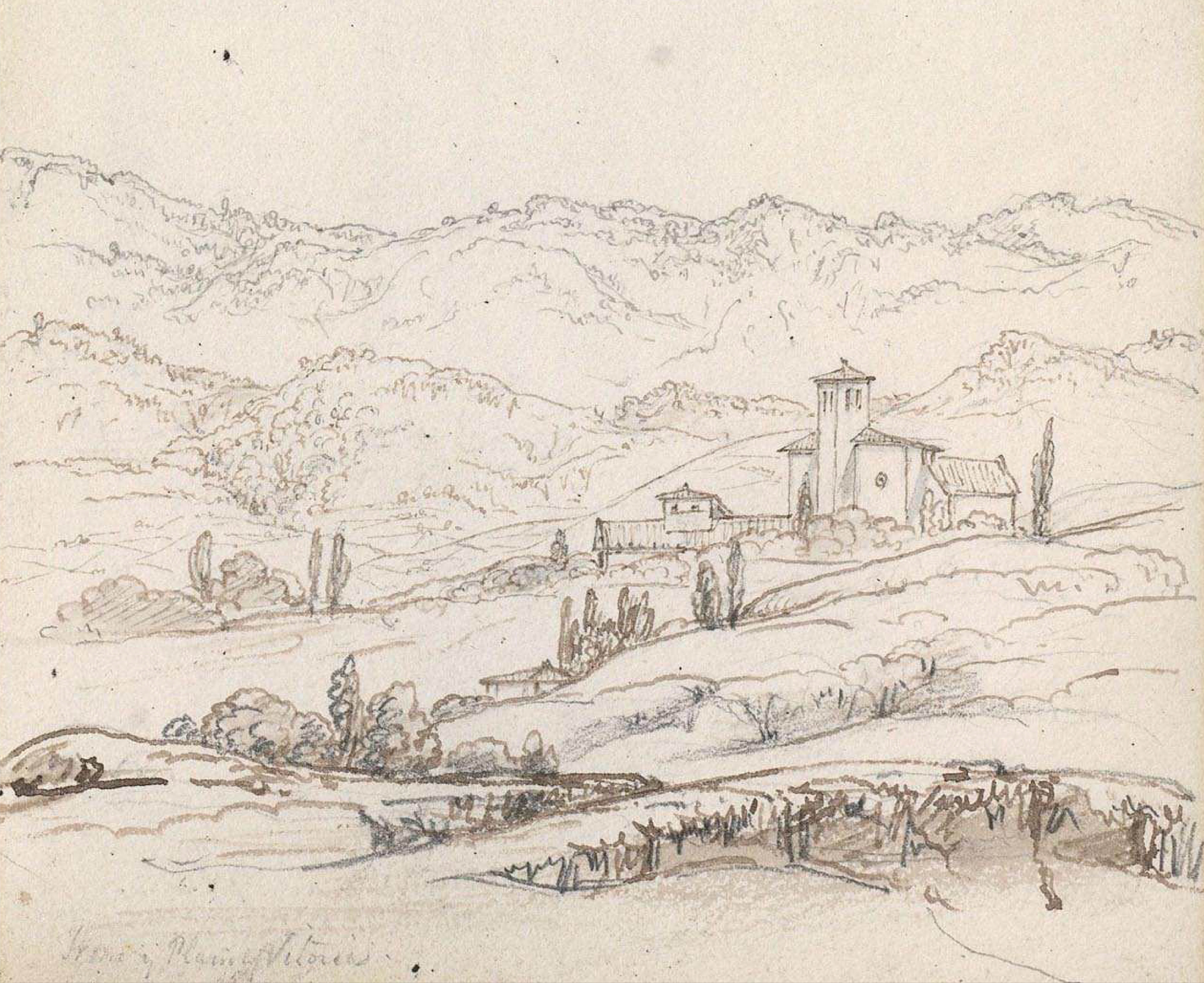Ya para terminar, en el cuaderno de dibujos de la Biblioteca Nacional figuran estos dos bocetos asociados también a su paso por Álava: un paisaje montañoso y una casa ubicada junto a una arboleda. Recursos como estos le serían útiles a la hora de definir los ingredientes definitivos de la litografía, en las que vemos como se combina un tratamiento fiel y verosímil del paisaje con la inclusión de tipos populares, atuendos y tareas agrícolas. En este sentido, el caserón abocetado se parece mucho a la casa que ha colocado a la derecha en primer plano en la vista general de Vitoria.