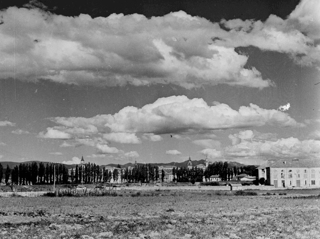 En la parte superior, encontramos las siguientes anotaciones manuscritas: “St. Domingo”, “Cathedral”, “Vitoria”, «St. Pedro», «St. Miguel» y «St. Francisco». Pensemos que los dos principales conventos vitorianos todavía estaban en uso para esa fecha, pues ambas comunidades serían exclaustradas en abril de 1834, una vez demostrada su vinculación con la sublevación carlista. La disposición de las torres y el encuadre empleado en el dibujo nos invita a pensar que la panorámica se obtuvo (aproximadamente) desde Abendaño, por el camino de Ali y cerca quizás de la ermita de San Martín –de nuevo la misma advocación–. Como curiosidad, podemos compararla con esta preciosa foto de la colección López de Guereñu (Signatura: ATHA-GUE-CD-13576):