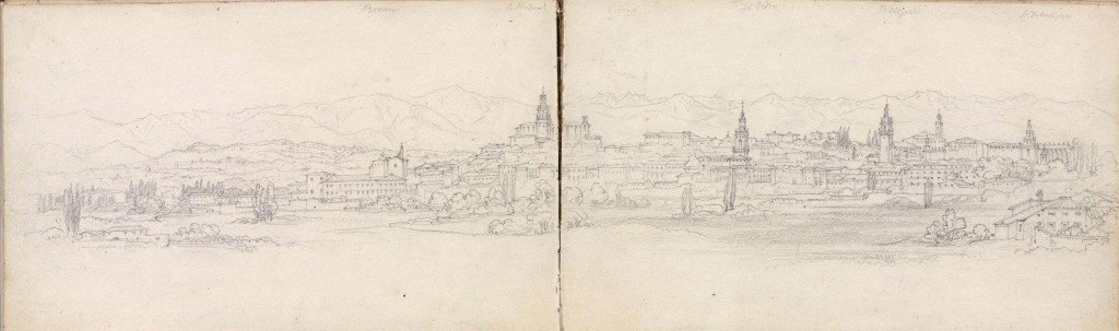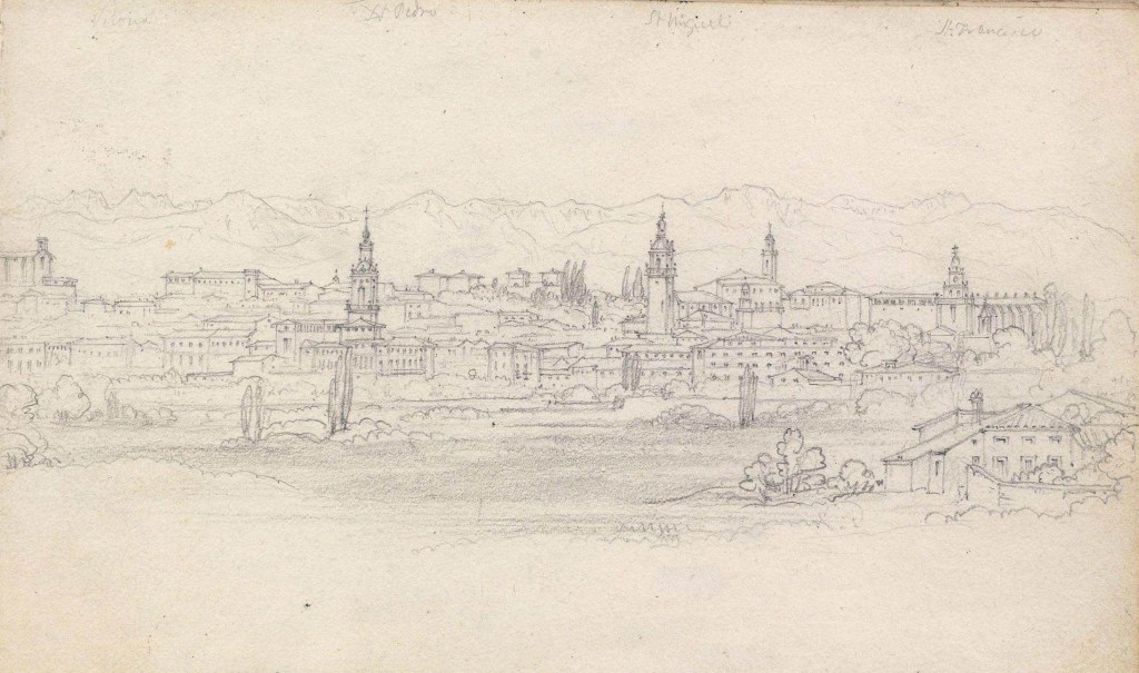 En esta ocasión, nos vamos a centrar en uno de estos viajeros con una destacada vena artística: George Vivian (1798-1873). En su caso, fueron dos los viajes realizados, en 1833 y 1837. Y lógicamente, fueron muchos los cambios percibidos por este acomodado terrateniente inglés en la segunda visita, debido al azote que supuso la Primera Guerra Carlista y las corrientes desamortizadoras. Son varias las vistas de Vitoria y alrededores que vamos a poder analizar, las cuales cuentan además con un elemento particular que las hace más ricas. Podemos consultar los libros en los que aparecieron las litografías definitivas que compendiaban sus viajes a España, pero también conservamos un valioso álbum de dibujos a lápiz (custodiado en la Biblioteca Nacional de España), que nos permite contrastar el apunte original tomado in situ con la elaboración final.