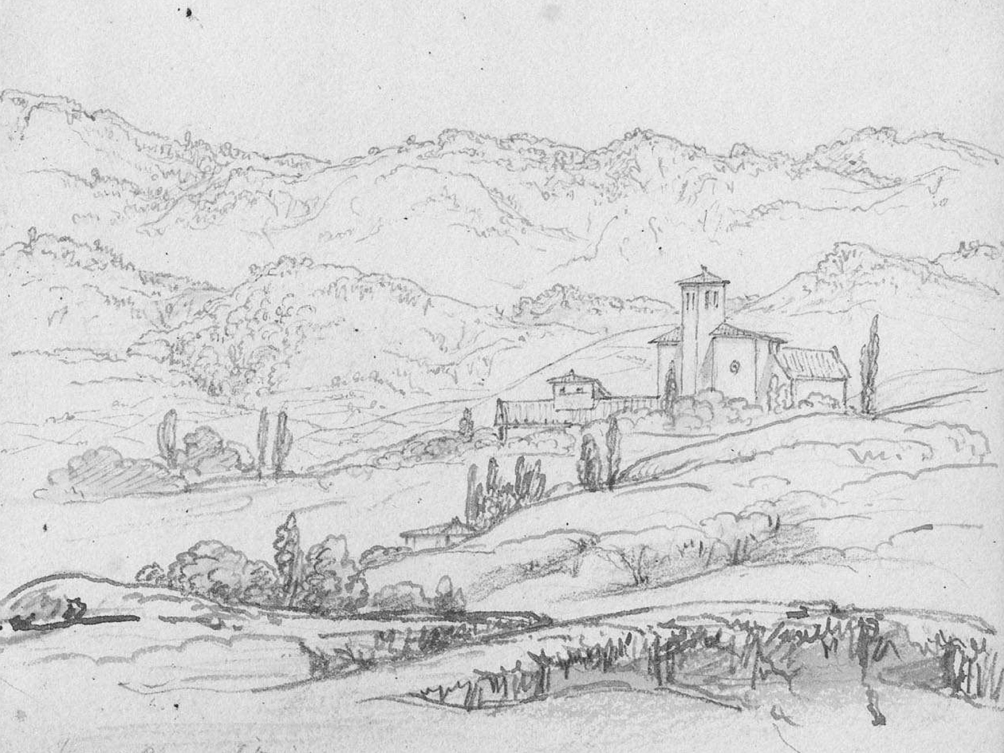 Ya para terminar, en el cuaderno de dibujos de la Biblioteca Nacional figuran estos dos bocetos asociados también a su paso por Álava: un paisaje montañoso y una casa ubicada junto a una arboleda. Recursos como estos le serían útiles a la hora de definir los ingredientes definitivos de la litografía, en las que vemos como se combina un tratamiento fiel y verosímil del paisaje con la inclusión de tipos populares, atuendos y tareas agrícolas. En este sentido, el caserón abocetado se parece mucho a la casa que ha colocado a la derecha en primer plano en la vista general de Vitoria.