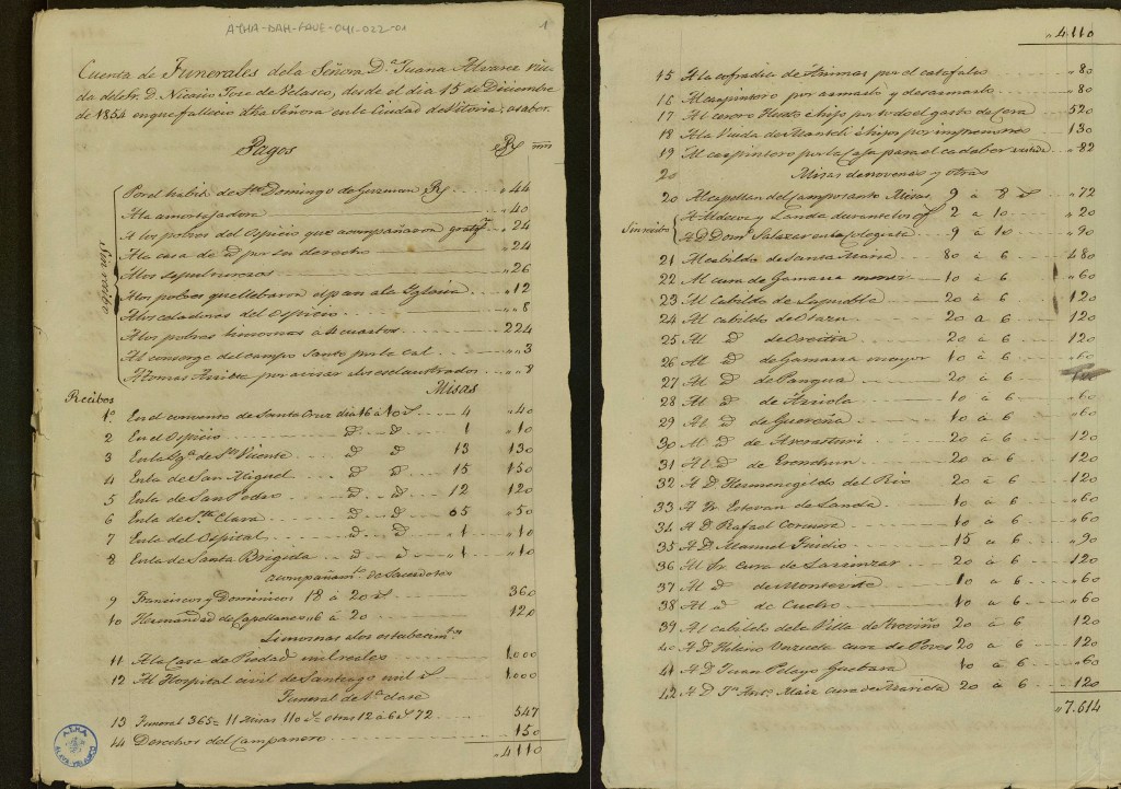 Como curiosidad, los tentáculos de los Velasco-Álvarez abarcaban buena parte de la provincia, por lo que encontramos un último listado de “Misas novenas y otras”, repartidas por todo el territorio: Arriola, Gamarra Mayor, Gamarra Menor, Otazu, Oreitia, Pobes, Aberasturi, Erenchun, Treviño, Pangua, Montevite, Cucho, Larrinzar, Guevara, Marieta o Lapuebla. En total, la suma de los recibos derivados de los funerales de Juana alcanza los 7614 reales. Una cifra descomunal, si la comparamos con los 420 reales que costaba la sepultura de 1º clase en el proyecto para Santa Isabel de 1831.