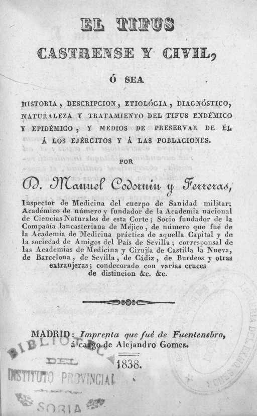 – Codorniu y Ferreras, Manuel – El tifus castrense y civil (Madrid: Imprenta que fue de Fuentenebro, a cargo de Alejandro Gómez, 1838).