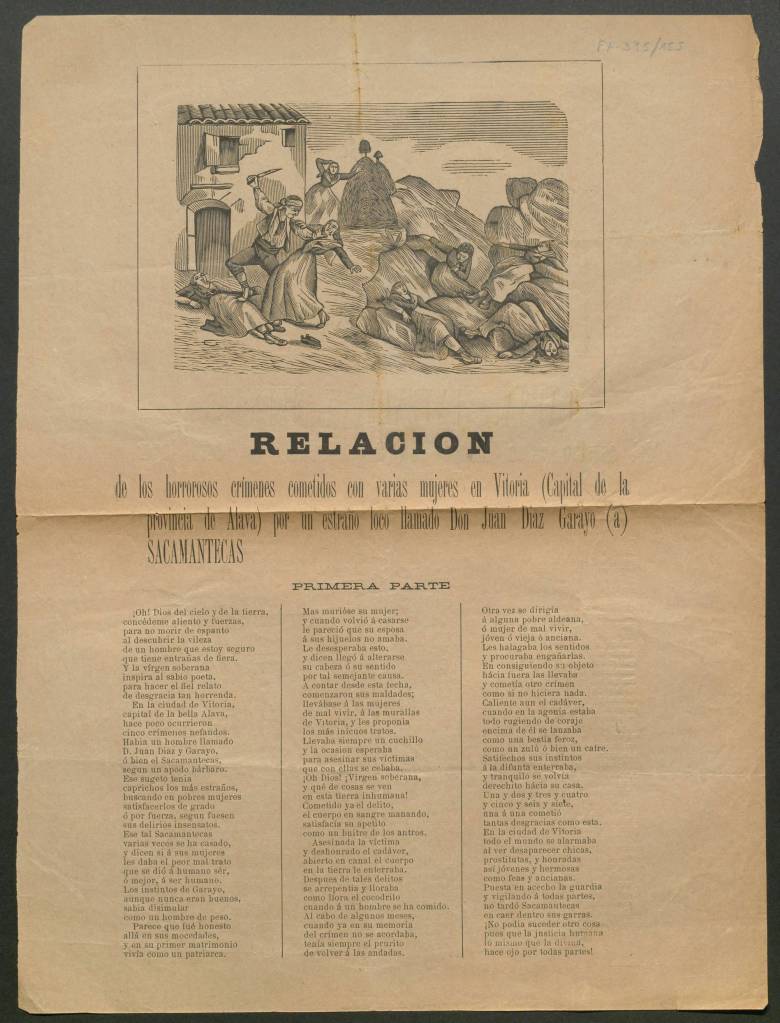 – «Relacion de los horrorosos crímenes cometidos con varias mujeres en Vitoria (Capital de la provincia de Alava) por un estraño loco llamado Don Juan Diaz Garayo…», colección digital Literatura de canya i cordill (Universitat de Barcelona). Signatura: FA-395_155_0001.