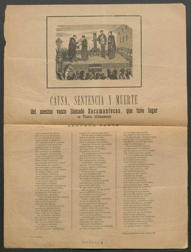 Con la recuperación de este pliego de cordel, vinculado a la figura del asesino alavés, sumamos una nueva mirada a esta causa criminal que nunca deja de sorprendernos. Cabe preguntarse cuantos se imprimieron, cómo sería el romance que se vendió en las calles vitorianas, durante cuantos años seguirían cantándose sus crímenes y su ajusticiamiento, y sí habrá algún ejemplar perdido en algún archivo familiar vitoriano. No me consta que en Archivo Municipal de Vitoria-Gasteiz o en la Fundación Sancho el Sabio dispongan de ninguna copia. El ejemplar que aquí hemos analizado, con el plus de haber sido publicado en Cataluña, parece quizás una creación ligeramente posterior al año de ejecución, uno de tantos ecos de esta causa criminal tan celebre, que terminó elevando a su protagonista a la categoría de leyenda, situándolo en el terreno casi fantástico de los asustaniños ibéricos (el Coco, el Hombre del Saco, el Tío Saín, etc.). Resultaría quizás algo extraño narrar y vender en el mismo día de la ejecución una ‘relación’ como esta, carente de inmediatez y donde parece pesar una cierta distancia y un mínimo poso reflexivo. Justo al final del romance se anota “es propiedad de Juan Laguarda”, una pista que no nos permite afinar más el tiro, ni concretar la fecha de ejecución del romance. En cualquier caso, la imprenta en la que se realizó si encaja con el periodo analizado, pues el taller de Evarist Ullastres tuvo gran fama en la ciudad condal desde finales de la década de 1870.