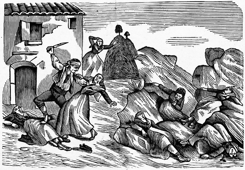 Antes de terminar, merece la pena fijarse en los dos sencillos grabados que ilustran las hojas impresas. En el primero, el asesino parece casi un bandolero cuchillo en mano, a punto de acabar con la vida de una victima más, y habiendo asesinado ya a cinco mujeres, cuyos cuerpos se representan arrojados por el terreno. En la segunda página, vemos una escena un tanto genérica del instante previo a que el reo sea sentado en el garrote, con varios religiosos subidos en el patíbulo, el acompañamiento de los cofrades al fondo y una protección militar que forma un perímetro de seguridad. Junto al aparato figura quizás el verdugo, apoyado en el tornillo de la maquina letal.