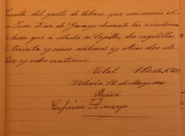 Entre los materiales ligados a su causa que se conservan en el Archivo Municipal de Vitoria-Gasteiz, sorprenden las minutas y los gastos derivados del procedimiento. Así, se conserva la factura del sastre por la túnica, la de la cera gastada o, lógicamente, la del tabaco consumido. En ella leemos: «Cuenta del gasto de tabaco que consumió el reo Juan Díaz de Garayo durante las veinticuatro horas que ha estado en Capilla, dos cajetillas de treinta y cinco céntimos y otras dos de diez y ocho céntimos».